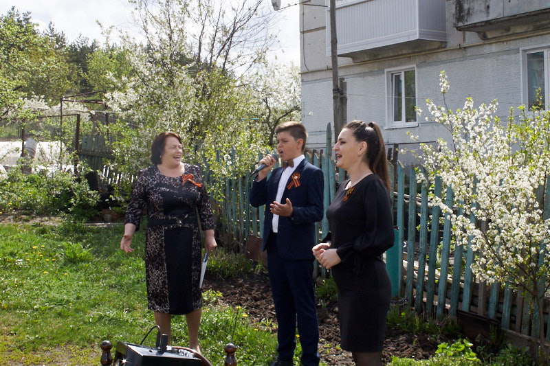 Вожатая школы Ольга Кальдина, педагог Центра дополнительного образования Римма Володина и ученик 5 класса камешкирской школы Егор Чадаев исполнили песню «День Победы» в микрорайоне по улице Лермонтова.