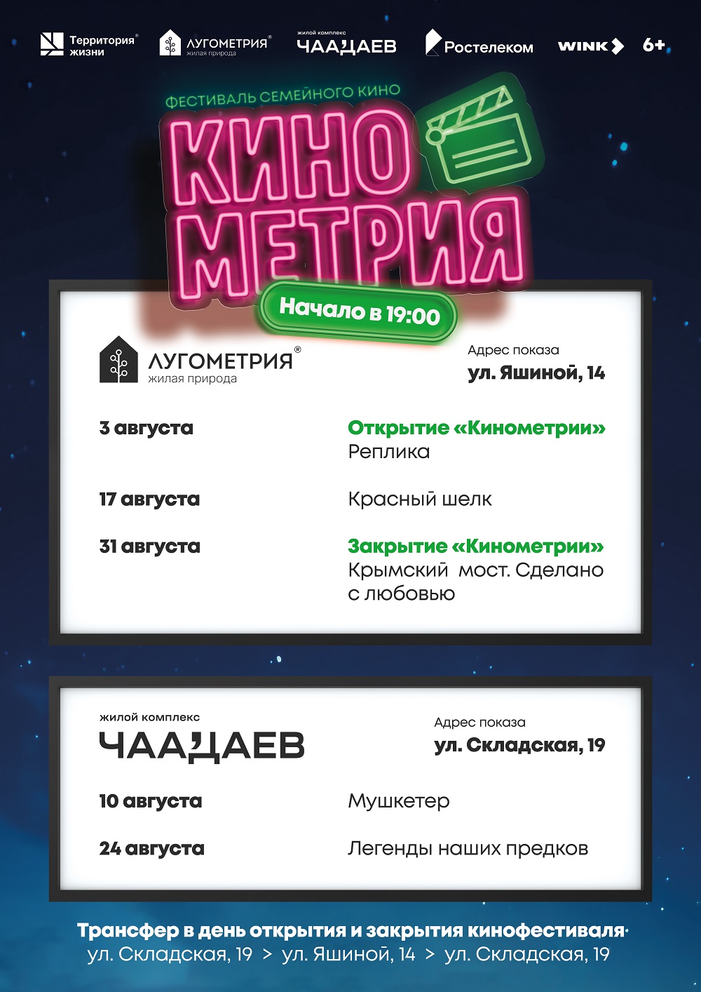 Группа компаний «Территория жизни» и ПАО «Ростелеком» при поддержке видеосервиса Wink приглашают пензенцев на юбилейный пятый кинофестиваль «Кинометрия» (6+), который пройдет в жилых комплексах «Лугометрия» и «Чаадаев».