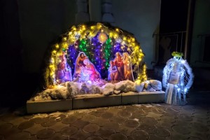 Благодаря Наталье Николаевне, Елене Александровне и Анюте с каждым разом становится всё наряднее и рождественское убранство нашего храма. В 2025 году предпочтение в оформлении его интерьера было отдано белому цвету, создававшему впечатление чего-то лёгкого, парящего, одновременно зимнего и ангельского. Многие иконы украшали живые белоснежные цветы. Число вертепов на это Рождество сравнялось с числом ёлочек у солеи: миниатюрный расположился недалеко от алтаря, а большой – перед самым входом в храм.