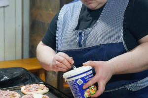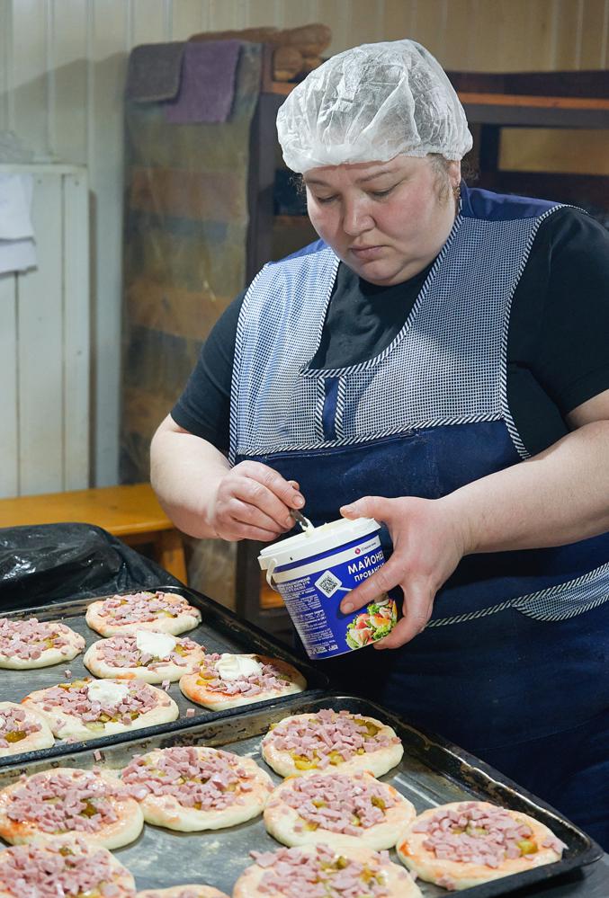 Мне разрешили понаблюдать за процессом изготовления выпечки. Ловкими привычными движениями мастерицы разделывают тесто на порции, мнут, надрезают, смазывают, раскладывают и раскатывают. Никакой суеты или спешки, но работа буквально кипит в умелых руках. Каждая работница знает свое дело, им даже не нужно обсуждать, кто из них и что будет делать в следующую минуту. Не успела я глазом моргнуть, а расстоявшиеся на противнях заготовки уже отправлены в печь, разогретую до 190 градусов. Румянятся в печи караваи, разрумянились от печного жара и лица женщин, а их руки уже раскладывают начинку в ватрушки, делят на порции тесто для беляшей и смазывают заготовки для пиццы.