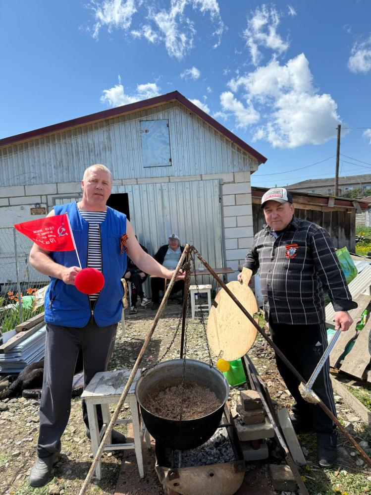 Жители многоэтажек на улице Юбилейной в райцентре решили отметить День Победы по-особенному. Они приготовили на костре солдатскую кашу и угостили ею односельчан.