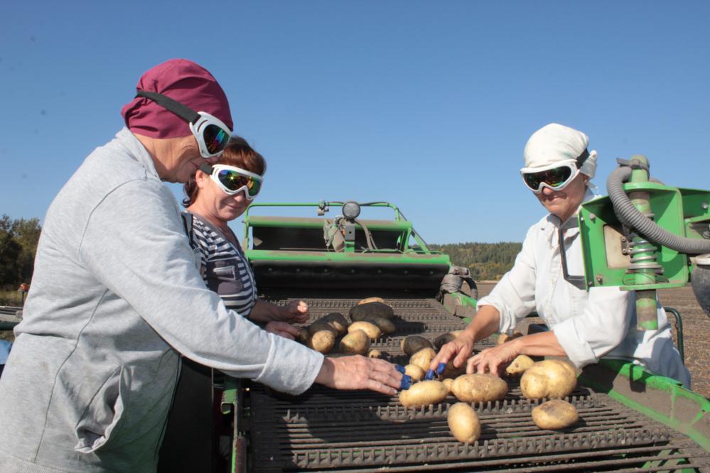 В уборке картофеля в поле принимают участие и женщины. В процессе работы комбайна, находясь на нем, они вручную отбирают с конвейерной ленты некондиционные клубни, остатки ботвы и земли, тем самым повышая качество собранного урожая. В поле трудятся бригады из Даниловки, Генеральщина, Чардыма. Также участвуют в уборке и наемные сотрудники из других регионов.