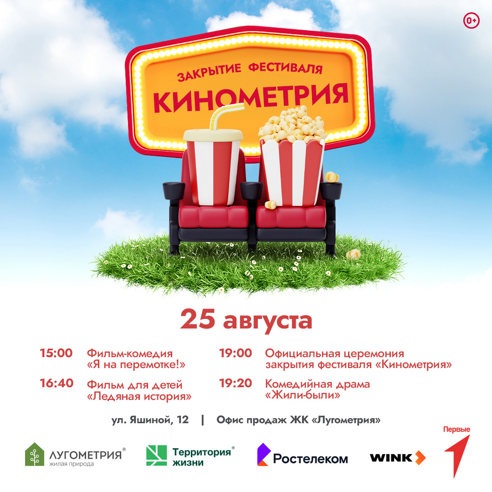 Церемония закрытия фестиваля по традиции пройдет в преддверии Дня российского кино. В этот день для зрителей состоится яркая праздничная программа, подведение итогов конкурса документального кино, киновикторина, а также показ перенесенных из-за непогоды кинофильмов — комедии «Я на перемотке» (12+) и сказки для детей «Ледяная история» (0+). Завершится фестиваль просмотром российской комедийной драмы «Жили-были» (16+) из коллекции видеосервиса Wink.