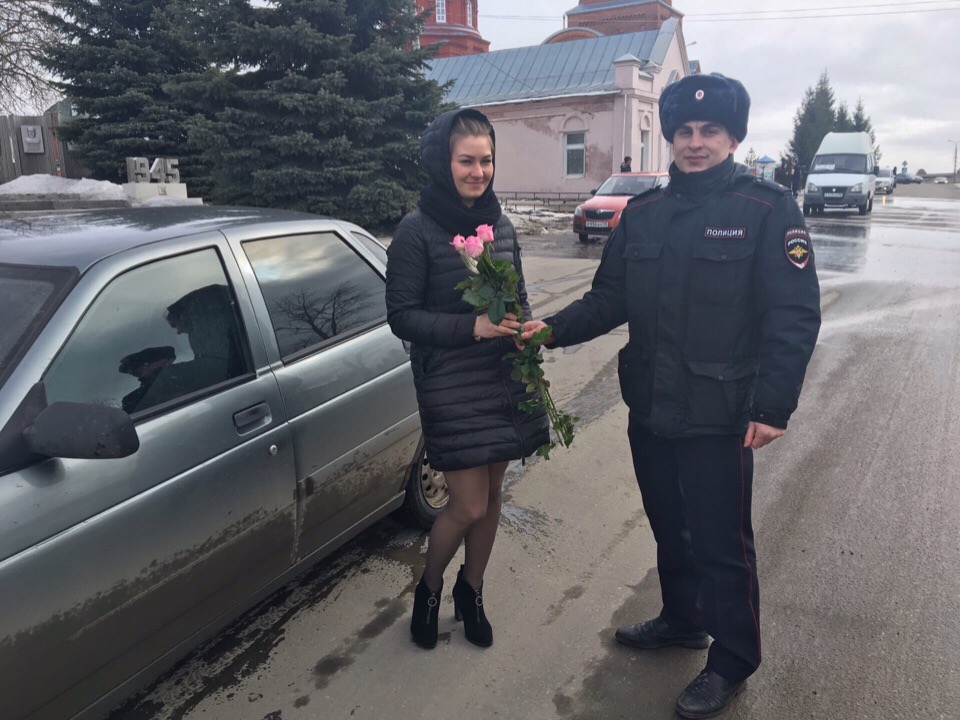 11 марта 2020 г., РИА Пензенской области. Накануне Международного женского дня на дорогах Мокшана сотрудники полиции вручали цветы и открытки женщинам - водителям.