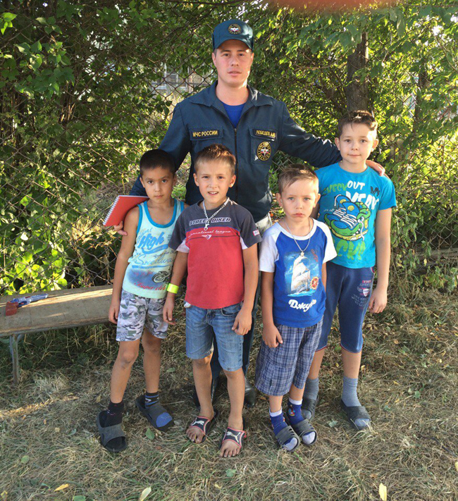 Приехавший первым на место пожара врио начальника 36 ПСЧ Александр Лебедев связавшись с диспетчером, отменил выезд пожарной машины, которая в это время выезжала из гаража, так как пожар был уже почти потушен добровольцами. И кто же они, эти огнеборцы. которые сражались с огнем на довольно большой площади (около десяти квадратных метров). Трое мальчишек, самому младшему из которых Тимерлану Аитову пять лет, его брату Нурлану девять, а Руслан Биксалеев пошел в этом году в первый класс. Под руководством взрослого соседа Александра Кузьмина подручными средствами (ведерки, чайники, лейки) они таскали из соседнего дома воду и поливали горящую траву. Самого маленького, четвертого, к тушению не допустили, он стоял в сторонке и давал дельные советы, так что его тоже можно причислить к добровольцам.