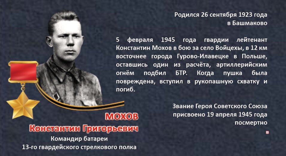 «Константин Мохов, Герой Советского Союза. При отражении контратаки врага, поддержанной самоходными орудиями, расчет одного из орудий батареи Мохова вышел из строя. Он сам встал к орудию, огнем из него подбил 1 БТР и уничтожил более 80 гитлеровцев.