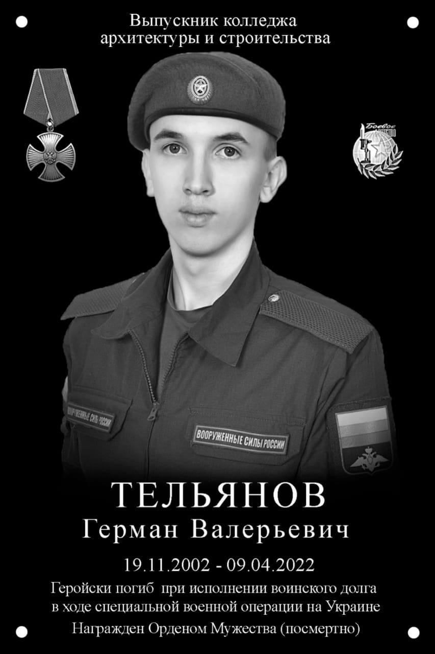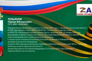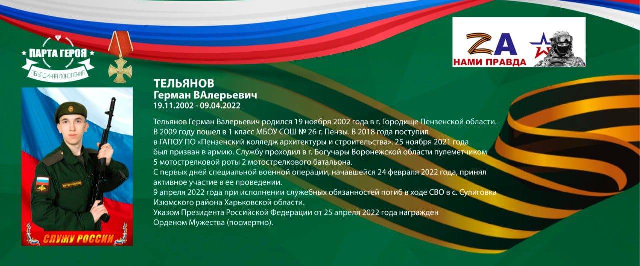 Третий портрет – самый болезненный и самый близкий. Герман Валерьевич Тельнянов (19.11.2002 – 09.04.2022). В 2021 году окончил Пензенский колледж архитектуры и строительства, был призван в армию. Солдат-пулеметчик срочной службы. Погиб при исполнении воинского долга в ходе специальной военной операции. Указом Президента РФ посмертно награжден орденом Мужества.