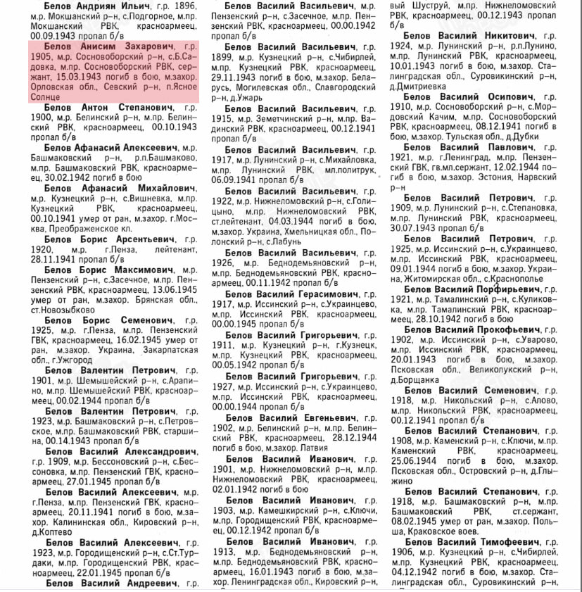 Первый портрет в нашем домашнем «Бессмертном полку» – Анисим Захарович Белов. Сержант, 1905 года рождения, из деревни Большая Садовка Пензенской области. На фронт был призван 3 июля 1941 года. В 1943-м погиб в бою, захоронен в братской могиле в Орловской области. Для архива он – строка. Для нашей семьи – вечная рана.
