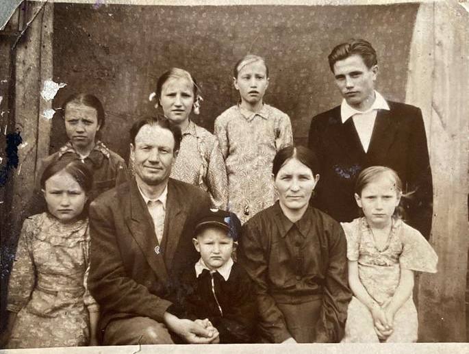 (слева направо): старший сын Вася, Таня, Валя, Маша, Люба, жена Анна Ивановна, Коля, Василий Герасимович и Нина.