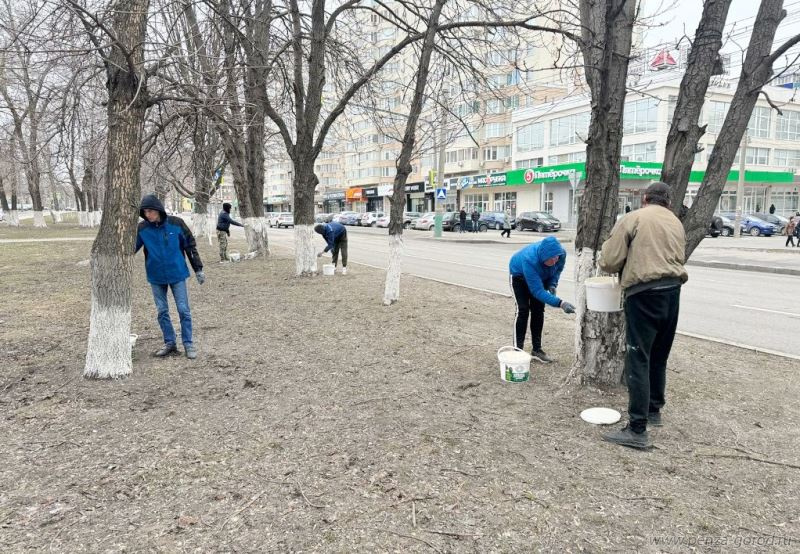 Продолжаются работы по побелке деревьев на улице Пушкина.