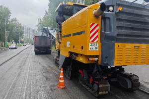 Рабочие осуществляют фрезерование верхнего слоя асфальта и приводят в порядок колодцы.