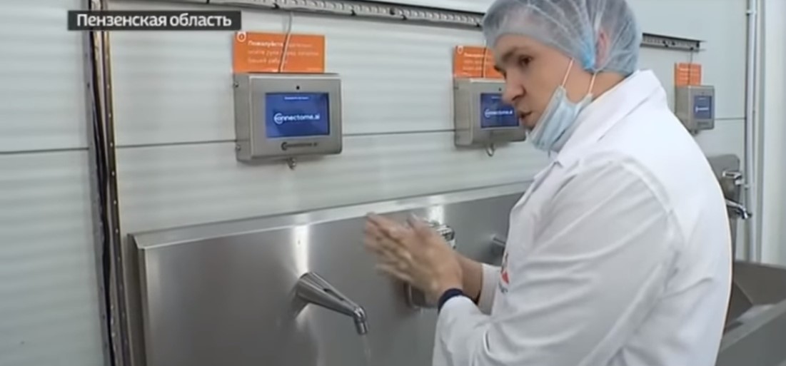 Автор сюжета Анастасия Розенкова рассказала, что сотрудников крупнейшего европейского предприятия по производству мяса индейки правильно мыть руки научили еще год назад. Тогда в санпропускнике установили умные умывальники, которые контролируют процесс мытья рук.