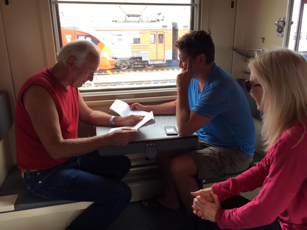 По пути следования в любимый город художника автор сценария фильма «Секретные краски Айвазовского» Лариса Трушина, актеры Евгений Панов и Павел Тачков в поезде обсуждают детали сценария и план съемок в Феодосии, а также в каких локациях они будут проводиться.