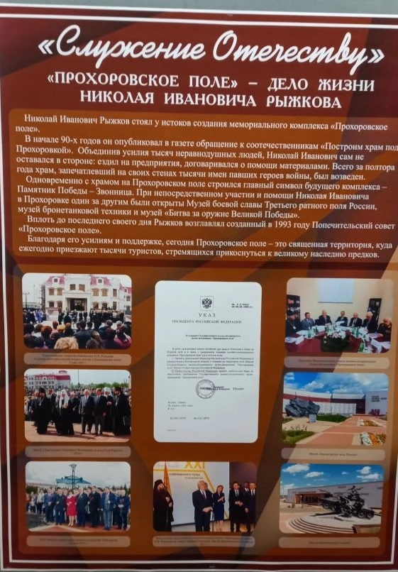 Особое место в экспозиции занимает история создания мемориального комплекса «Прохоровское поле» в Белгородской области, становлению которого Николай Иванович посвятил многие годы, возглавляя попечительский совет.