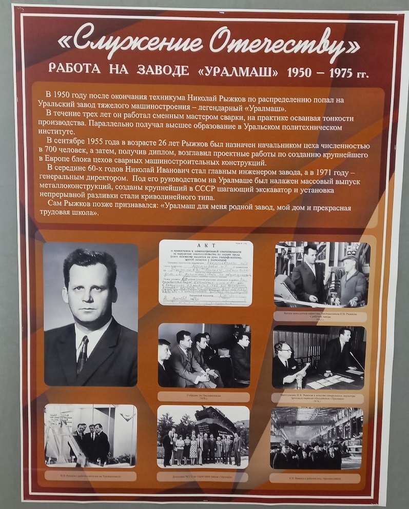 Выставка, на которой представлено более 150 мемориальных предметов, прослеживает удивительную карьеру Николая Ивановича: от простого сменного мастера легендарного завода «Уралмаш» он прошел путь до генерального директора предприятия. Под его руководством завод вдвое увеличил мощности, освоил выпуск уникальных шагающих экскаваторов и буровых установок, а также запустил масштабное строительство жилья для рабочих.
