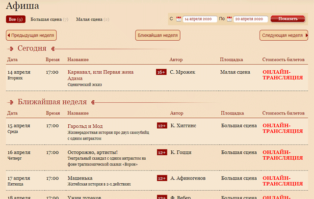 С 25 марта Пензенский драматический театр ведет в соцсетях трансляции архивных видеозаписей лучших спектаклей прошлых лет. А теперь посмотреть анонсы трансляций на ближайшее время и подключиться к их просмотру стало проще — вся информация с указанием даты и времени размещена в разделе «Афиша» официального сайта театра.