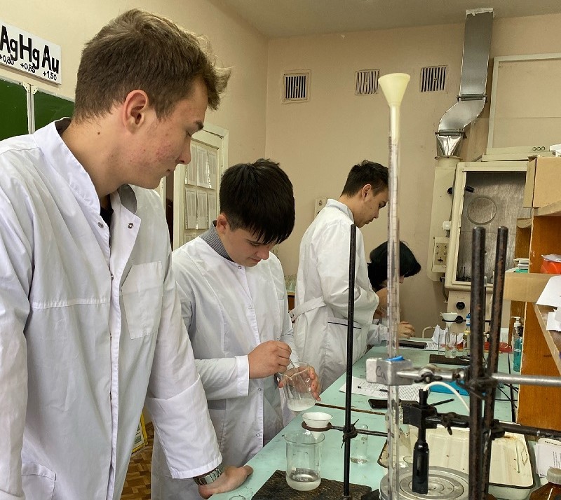Руслан Родин присутствовал на вузовской лекции по неорганической химии на тему «Растворы», а также на лабораторной работе по аналитической химии вместе со второкурсниками выполнил анализ по определению массовой доли бария в хлориде бария.