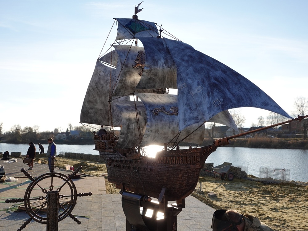 Скульптурная композиция «Хрустальный корабль» посвящена богатой истории стекольного производства в Никольском крае, начало которому было положено указом Екатерины II в 1764 году. Символично, что именно в этот период Российский императорский флот стал одним из самых мощных в мире.
