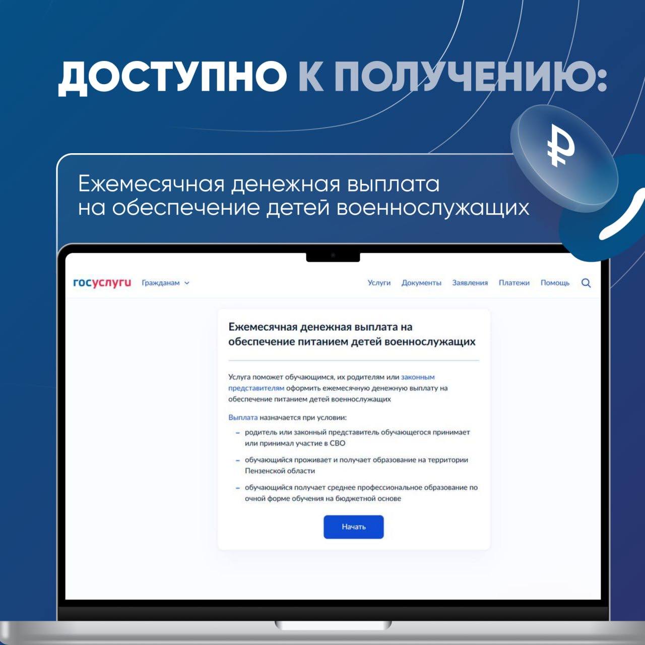Ключевым нововведением стала возможность подать электронное заявление на ежемесячное денежное обеспечение питанием студентов, которые обучаются очно на бюджетной основе по программам среднего профессионального образования. Воспользоваться сервисом на портале Госуслуг могут как сами учащиеся, так и их родители или законные представители.