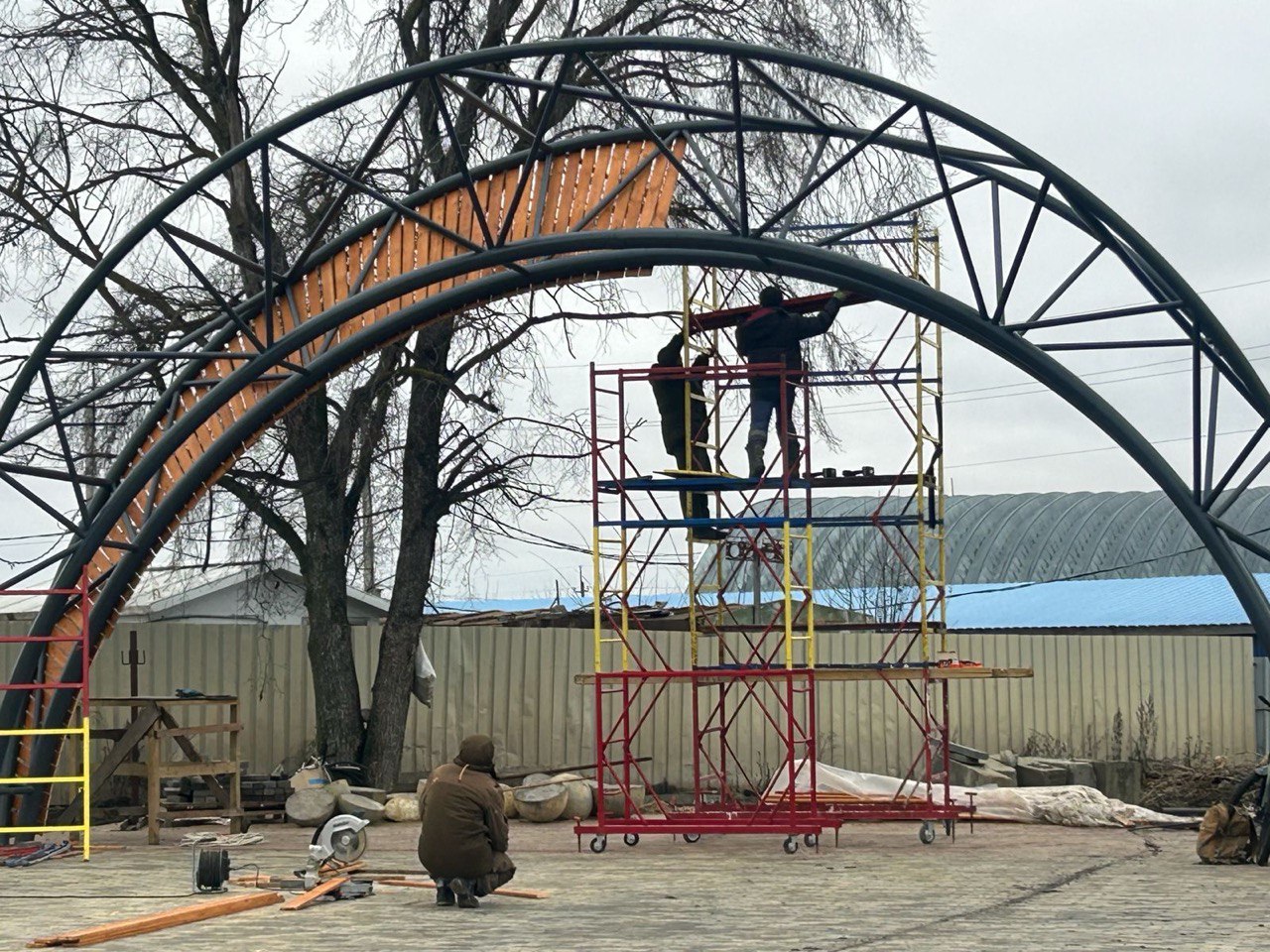 Параллельно специалисты подрядной организации возводят уникальную арку входной группы. Подрядчики уже приступили к монтажу декоративных реек, которые придадут будущему объекту узнаваемый и эстетичный вид.