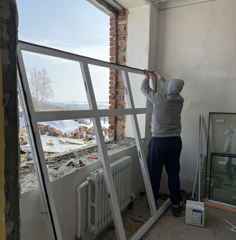 Уже демонтированы старые конструкции и коммуникации, включая двери, полы, систему отопления, канализацию и водопровод. Также смонтирована новая система отопления, утеплены и выровнены стяжкой полы, выложены стены и плитка на стенах и полу, установлены оконные блоки.