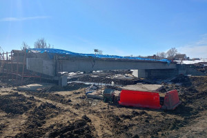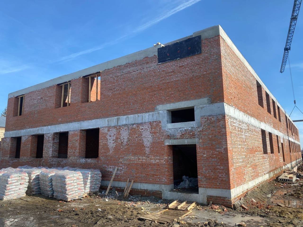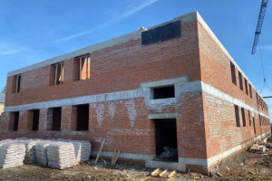 На площадке будущего корпуса продолжается возведение стен второго этажа, устройство внутренних перегородок и армирующего пояса.