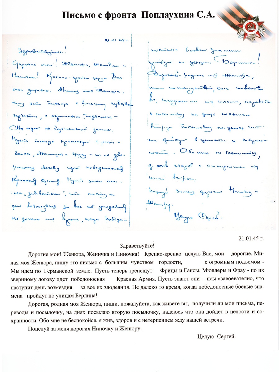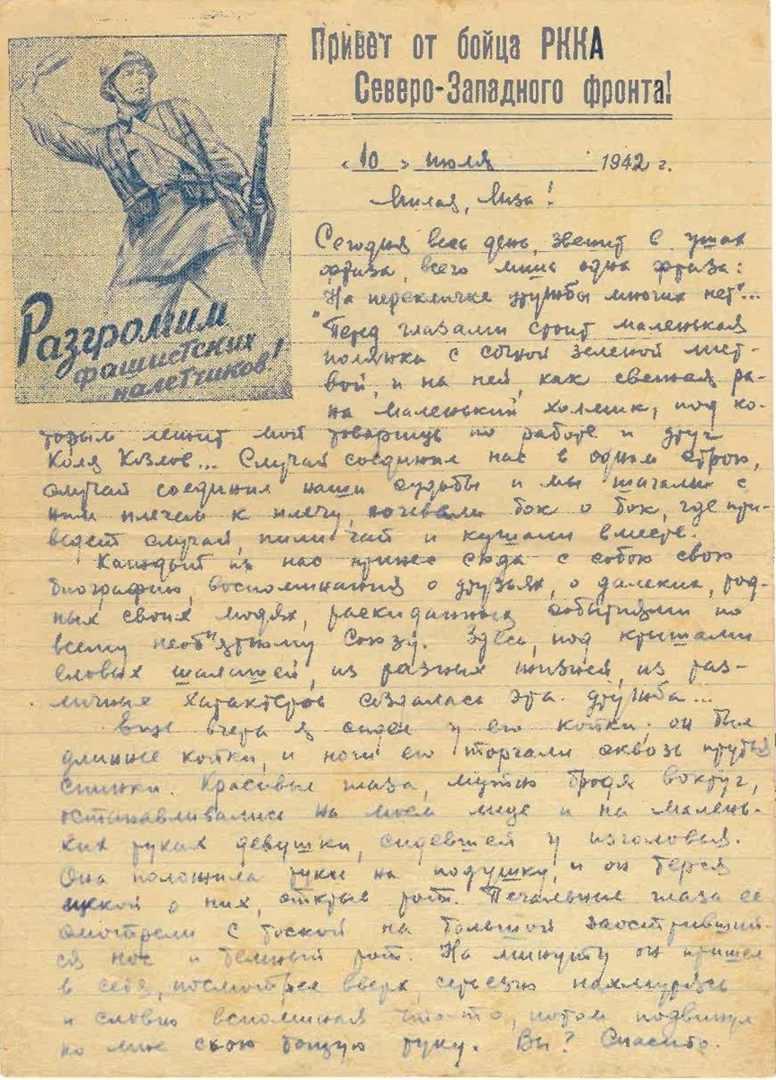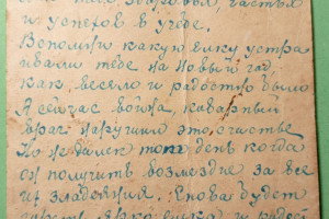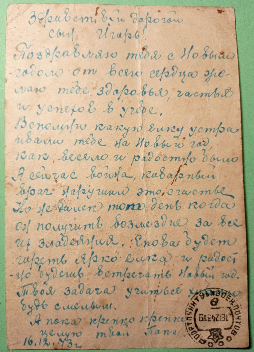 Например, один красноармеец в 1945-м писал домой о том, как близится час триумфа в Берлине, а другой отец накануне Нового года поддерживал сына словами ободрения и мечтал о встрече.
