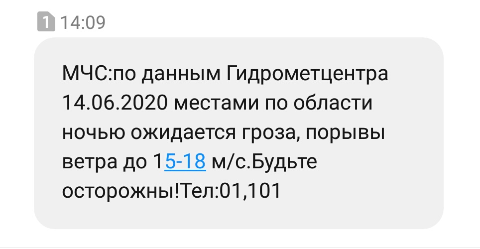 «14.06.2020 местами по области ночью ожидается гроза, порывы ветра до 15-18 м/с. Будьте осторожны», - смс с таким текстом получили многие жители региона.