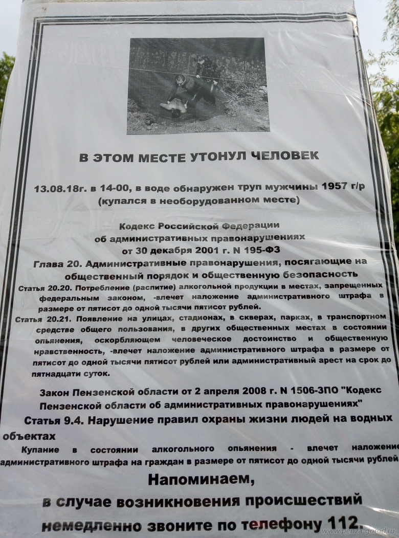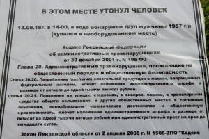 «Новые таблички дополнили размещенные ранее знаки «Купание запрещено». На них представлены также выдержки из законодательных актов об ответственности за правонарушения», - прокомментировали в пресс-службе администрации города Пензы.