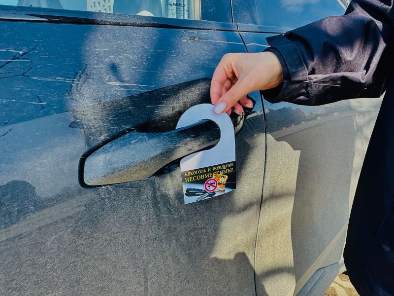 Дорхенгеры с напоминанием «сообщи о нетрезвом водителе» украсили дверные ручки более 20 припаркованных автомобилей: инспекторы прикрепили их на машины, чтобы водители не забывали о важности соблюдения ПДД.