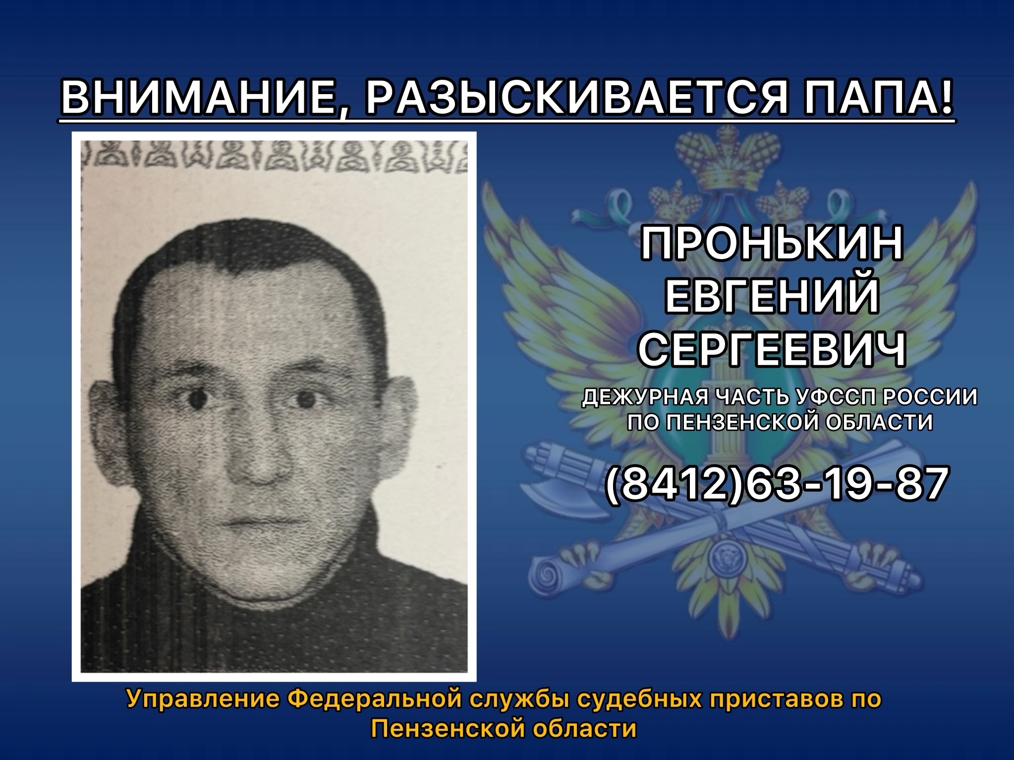 Судебная служба призывает граждан, располагающих любой информацией о местонахождении Пронькина Евгения Сергеевича, сообщать по телефонам: 45-45-89 или 90-65-29. Вся поступившая информация будет проверена и может помочь в задержании злостного неплательщика алиментов.
