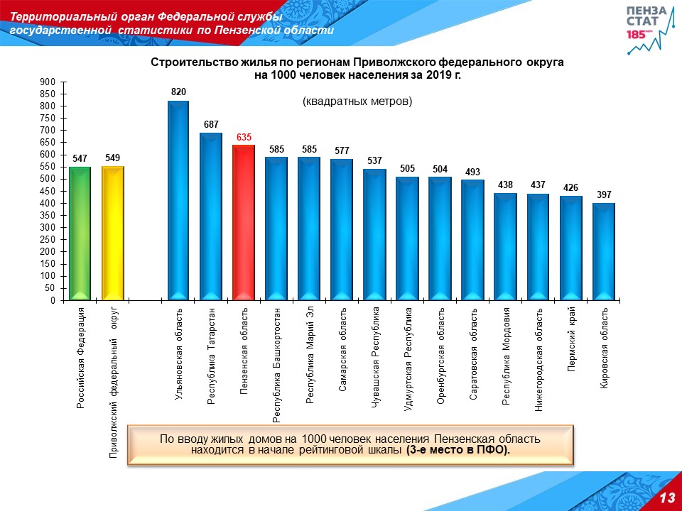 По темпам ввода жилых домов Пензенская область занимает 1-е место в ПФО и 8-е место в Российской Федерации. При этом, по РФ за прошедший год темп ввода жилья составил 104,9%.