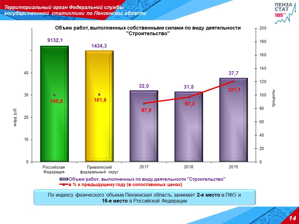 Он отметил, что объем работ, выполненных по виду деятельности «Строительство», за 2019 год составил 37,7 млрд рублей, или 121,1% к уровню 2018 года, это 2-е место в ПФО и 16-е - в Российской Федерации.