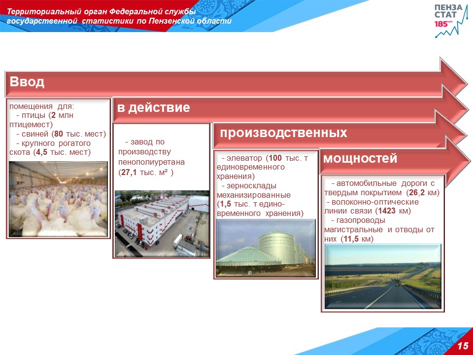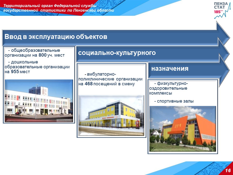 «За отчетный период введены в эксплуатацию: школа на 800 ученических мест, детские сады на 955 мест, что в 9 раз превышает показатель прошлого года, амбулаторно-поликлинические организации на 468 посещений в смену или в 4 раза больше показателя 2018 года, физкультурно-оздоровительные комплексы, спортивные залы», - информировал руководитель Пензастата.