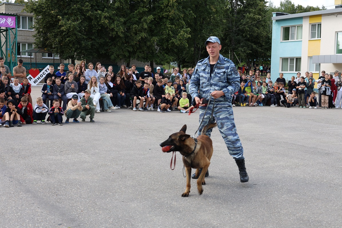 После зарядки перед ребятами выступили кинологи со служебными собаками, показав навыки послушания и дрессировки, что вызвало восторг у юных гостей. Мастер спорта международного класса по русскому жиму, заместитель начальника ЦКС регионального УМВД майор полиции Виталий Назаров рассказал детям о силовом виде спорта.