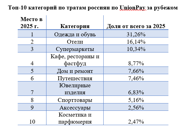 Объемы трат россиян за рубежом за 10 месяцев 2025 года по картам UnionPay выросли на 81,7% к аналогичному периоду прошлого года, выяснил Россельхозбанк. По состоянию на 2025 год число клиентов с тратами по картам UnionPay увеличилось в 2,5 раза. Самыми востребованными категориями стали «Одежда и обувь», «Отели» и «Супермаркеты». При этом существенно возрос интерес россиян к искусству.