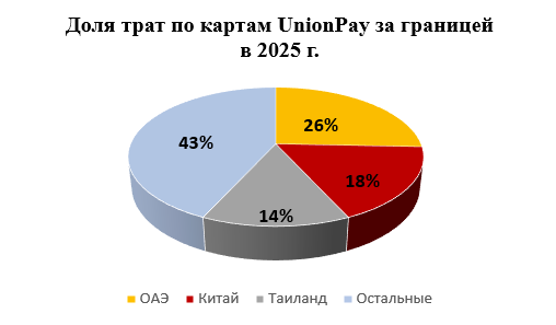Аналитики Россельхозбанка выделили три страны-лидера по общему объему трат по картам UnionPay за 2025 году за рубежом. Первую строчку занимают Объединенные Арабские Эмираты, что составляет 26% от общего объема трат (43%), на втором месте - Китай (18%) и на третьем - Таиланд (14%). На эти три государства приходится более половины всех зарубежных расходов россиян.