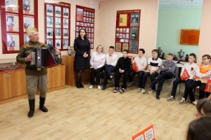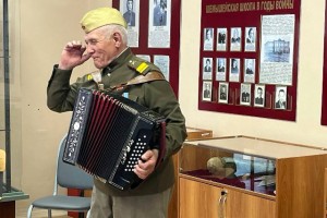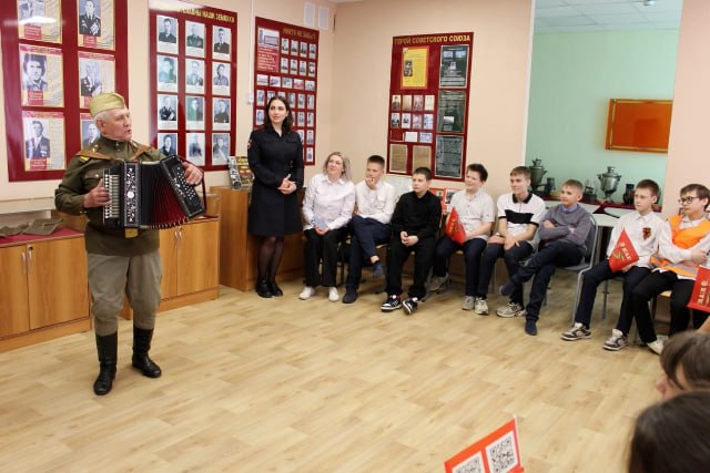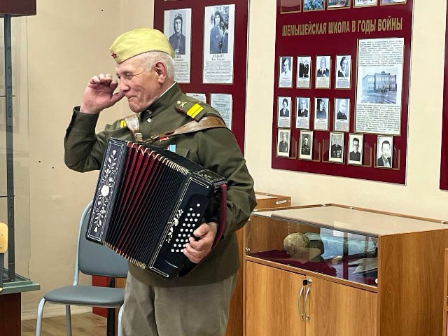 Николай Александрович, облачившись в гимнастерку и пилотку, перевоплотился в легендарного Василия Тёркина. Ребята, затаив дыхание, слушали истории о военных буднях, а артистизм гармониста превратил выступление в урок мужества.
