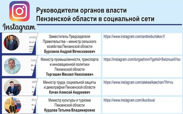 В начале лета губернатор Пензенской области Иван Белозерцев опубликовал на своей странице в Instagram ссылки на аккаунты заместителей председателя областного правительства, министров и начальников управлений, департаментов, комитетов региона, а также на страницы ведомств.