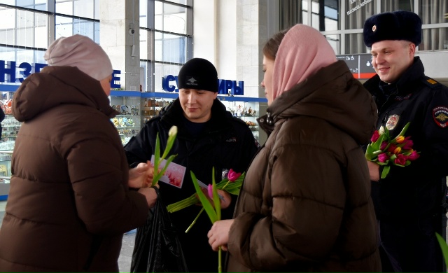 07 марта 2026 г., РИА Пензенской области. В преддверии Международного женского дня на железнодорожном вокзале Пенза-I сотрудники патрульно-постовой службы Пензенского ЛО МВД России на транспорте провели акцию «8 Марта - в каждый дом». Они поздравили женщин-путешественниц и подарили им цветы.