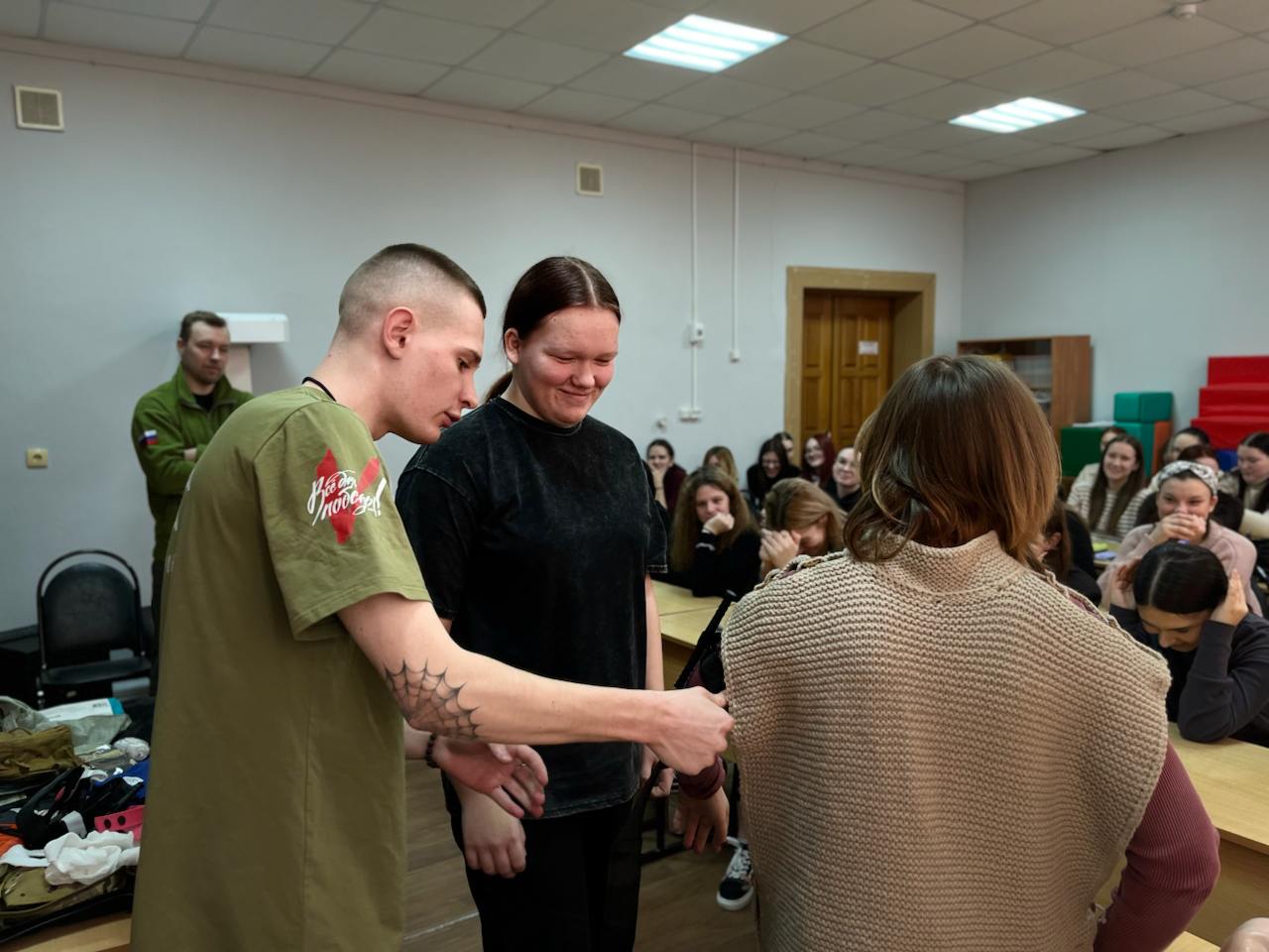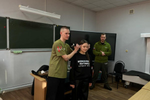 Герой специальной военной операции Андрей Ракушин, координатор молодежных проектов Общероссийского общественного движения «Народный фронт» Иван Банник и активист движения Ульяна Белякова объяснили обучающимся, как правильно оказывать первую помощь при ранениях и травмах, используя медицинские средства из набора тактической аптечки первой линии или «первого эшелона».
