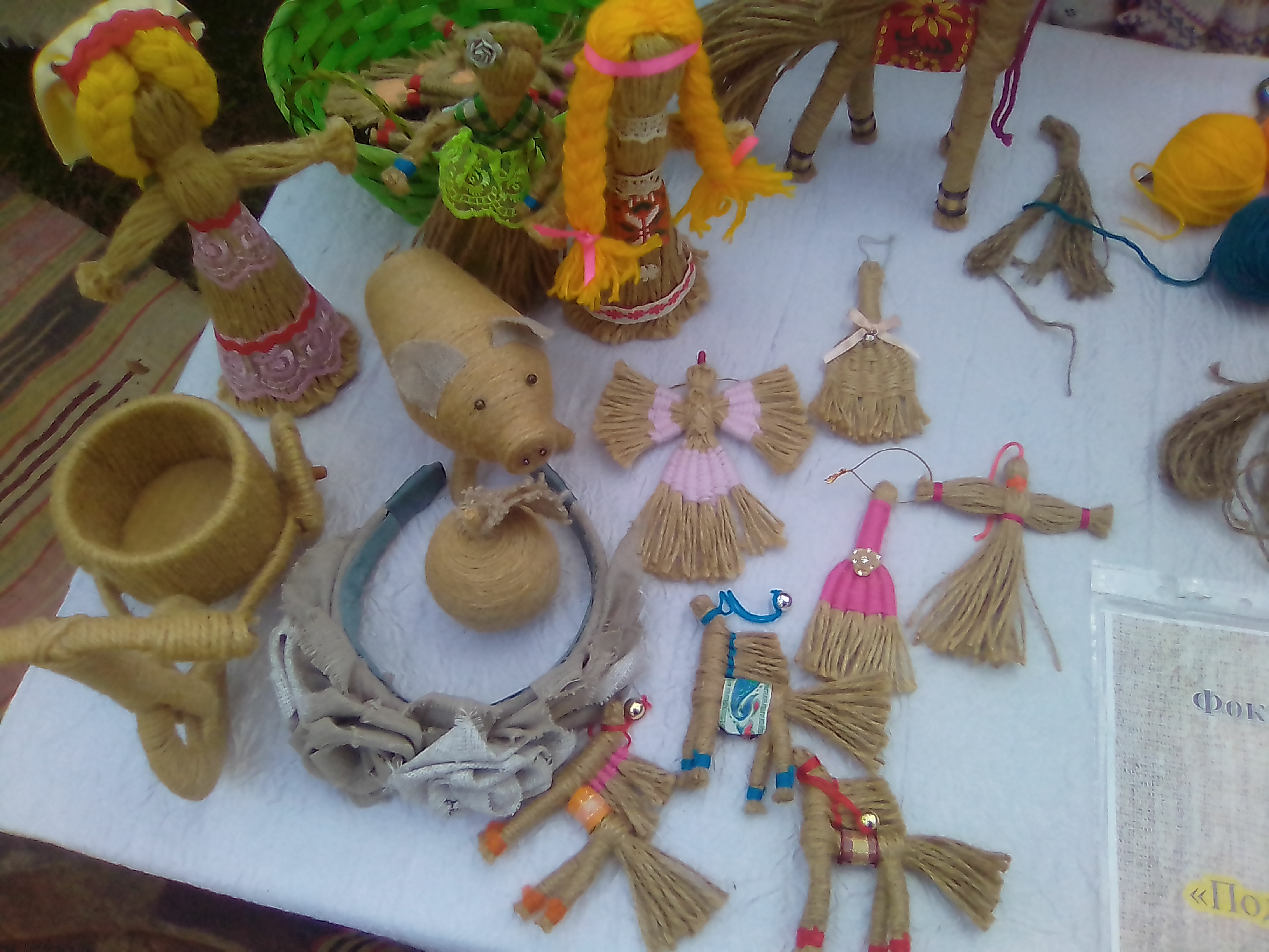 Ольга Фокусенко из села богословка Пензенской района провела мастер-класс по изготовлению джутового каната, который ранее изготавливали из лыка. Показала, что из него можно плести кукол, лошадей, сувениры. По ее словам, праздник замечательный, который имеет очень важное значение.