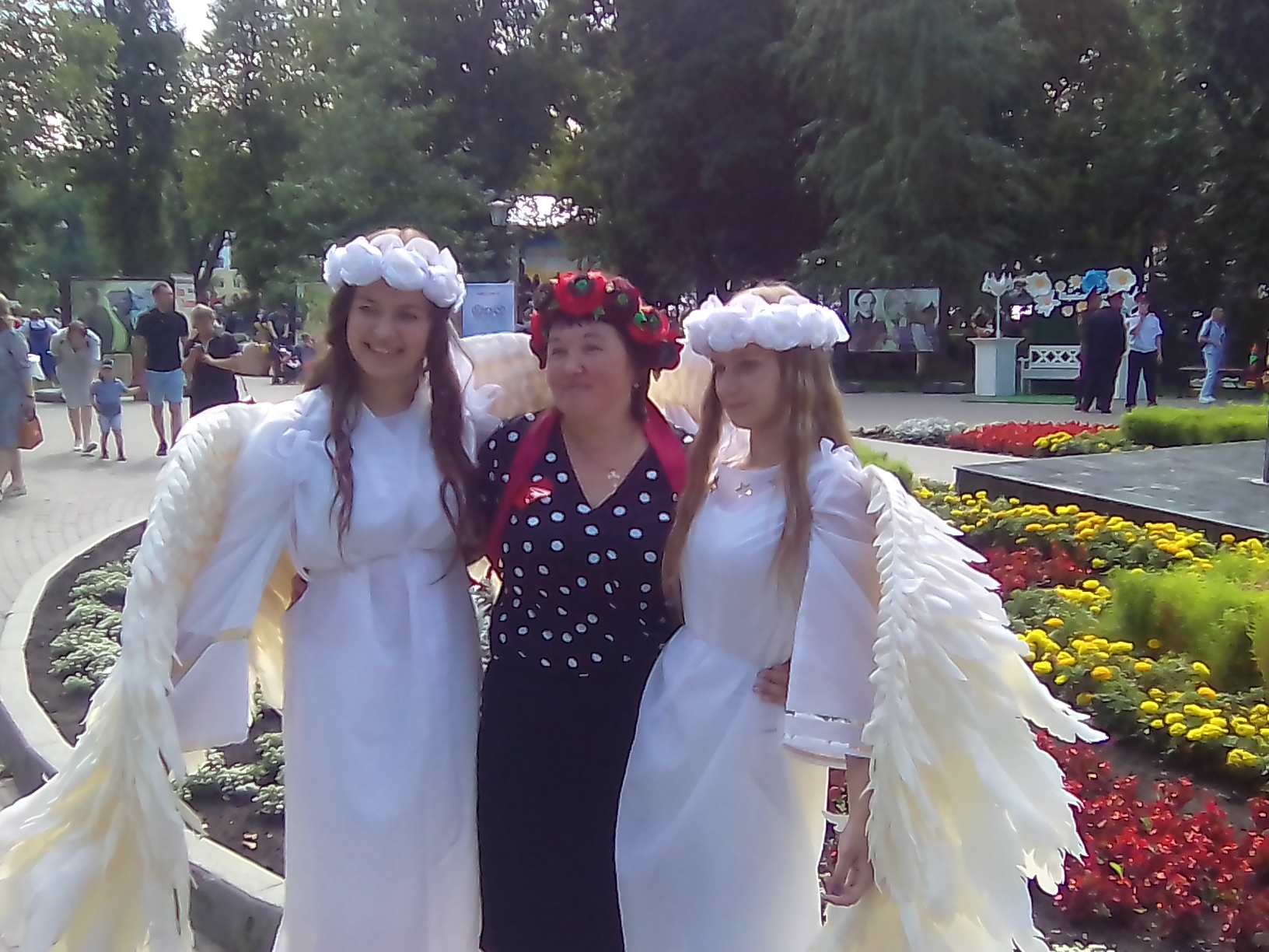 Девочки Настя и Екатерина из духовно-просветительского центра при Покровском архиерейском соборе города Пензы ходят по скверу в белых крыльях. Гости праздникам с удовольствием делают с ними снимки.