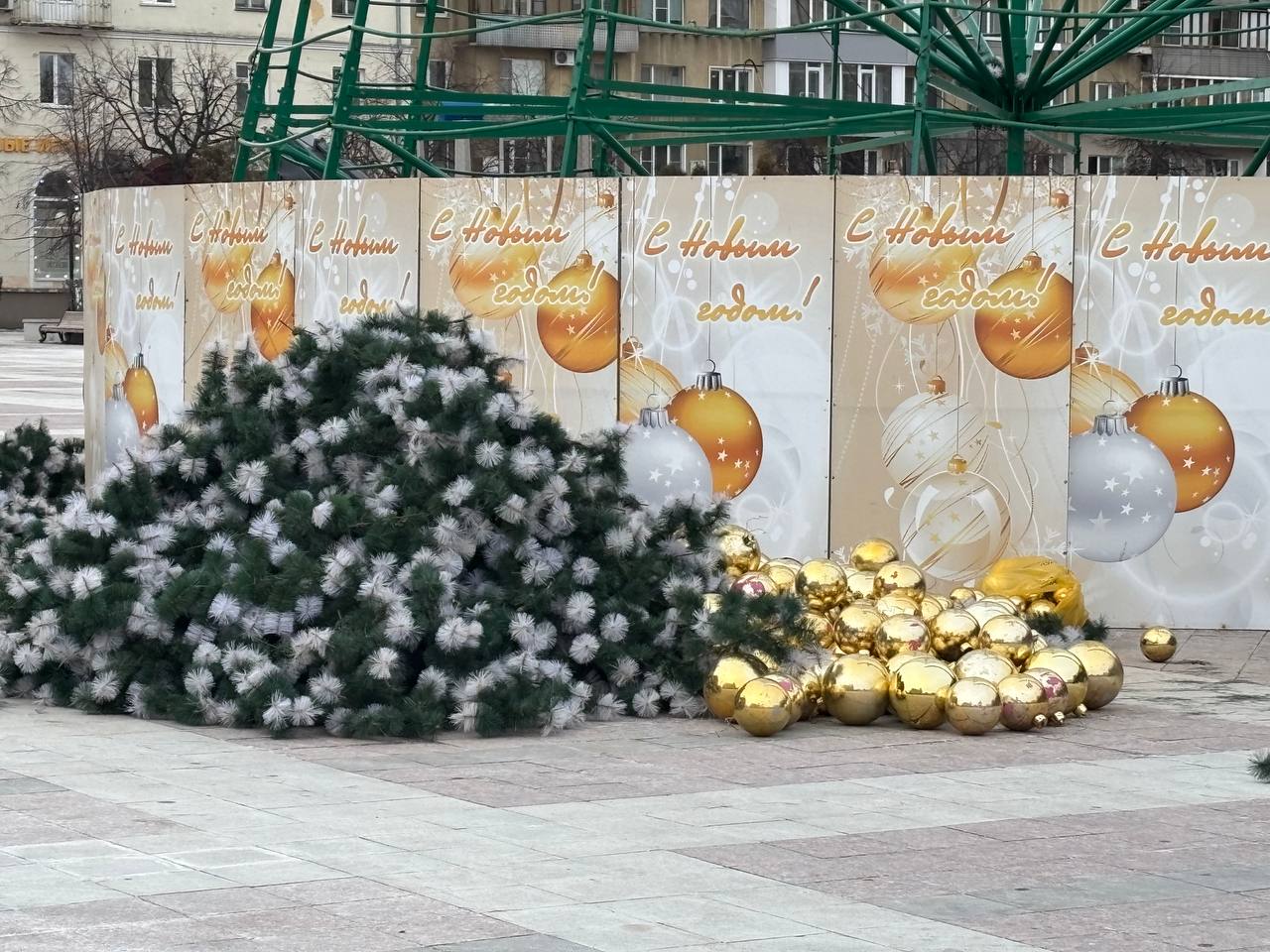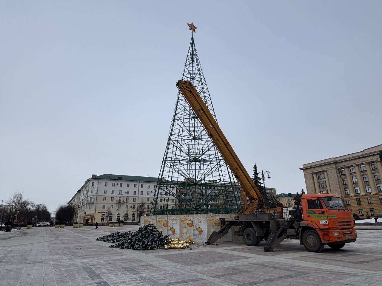 Так, на сегодняшний день елка уже стоит без украшений, остался лишь каркас и звезда. Все работы по демонтажу должны завершиться до 7 февраля.