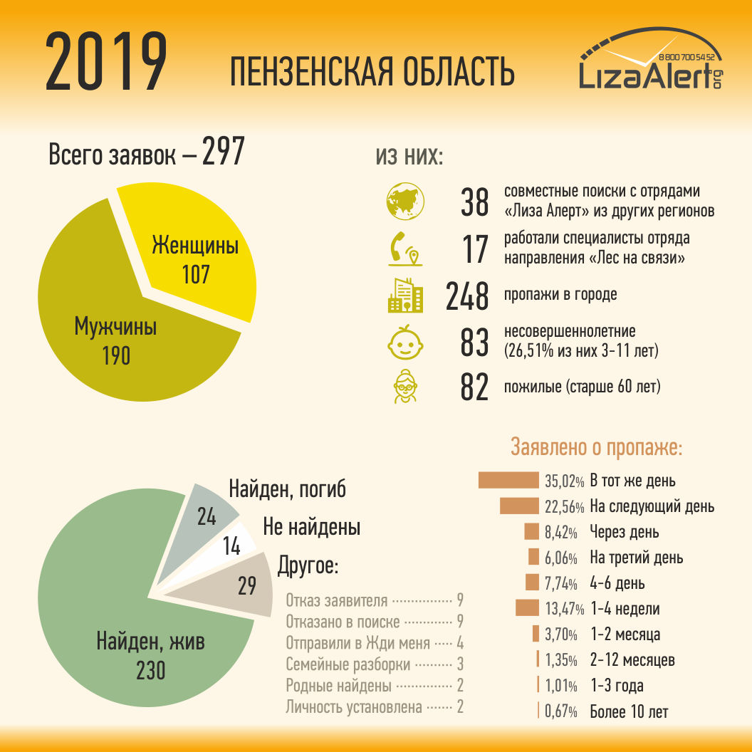 В официальной группе отряда в соцсети «ВКонтакте» отметили, что всего в 2019 году волонтеры получили 297 заявок. Это на 84% больше, чем в 2018-м (161).