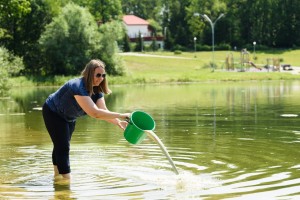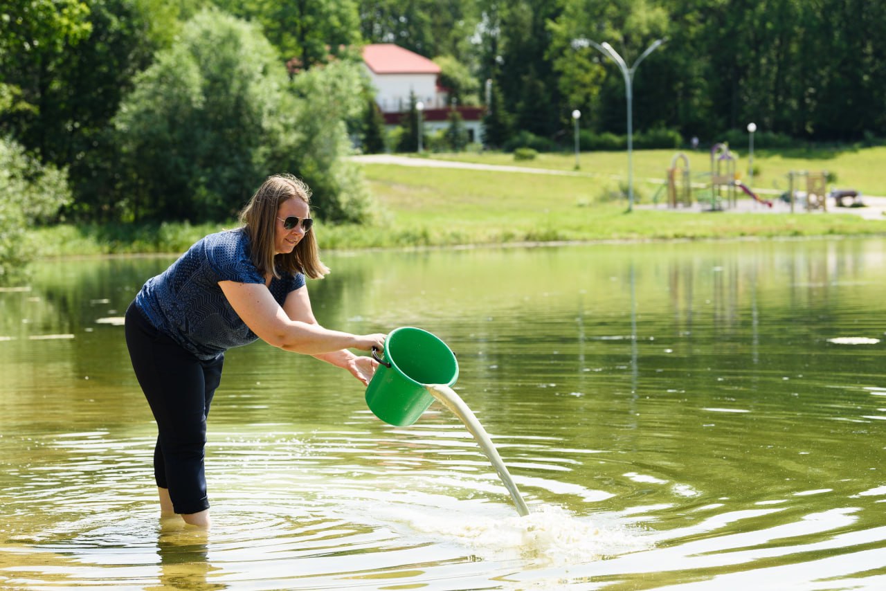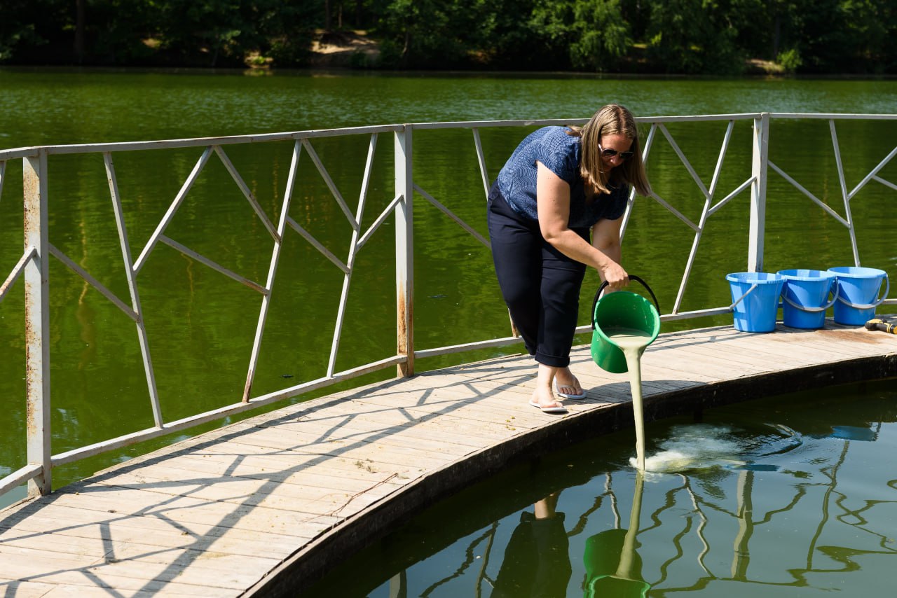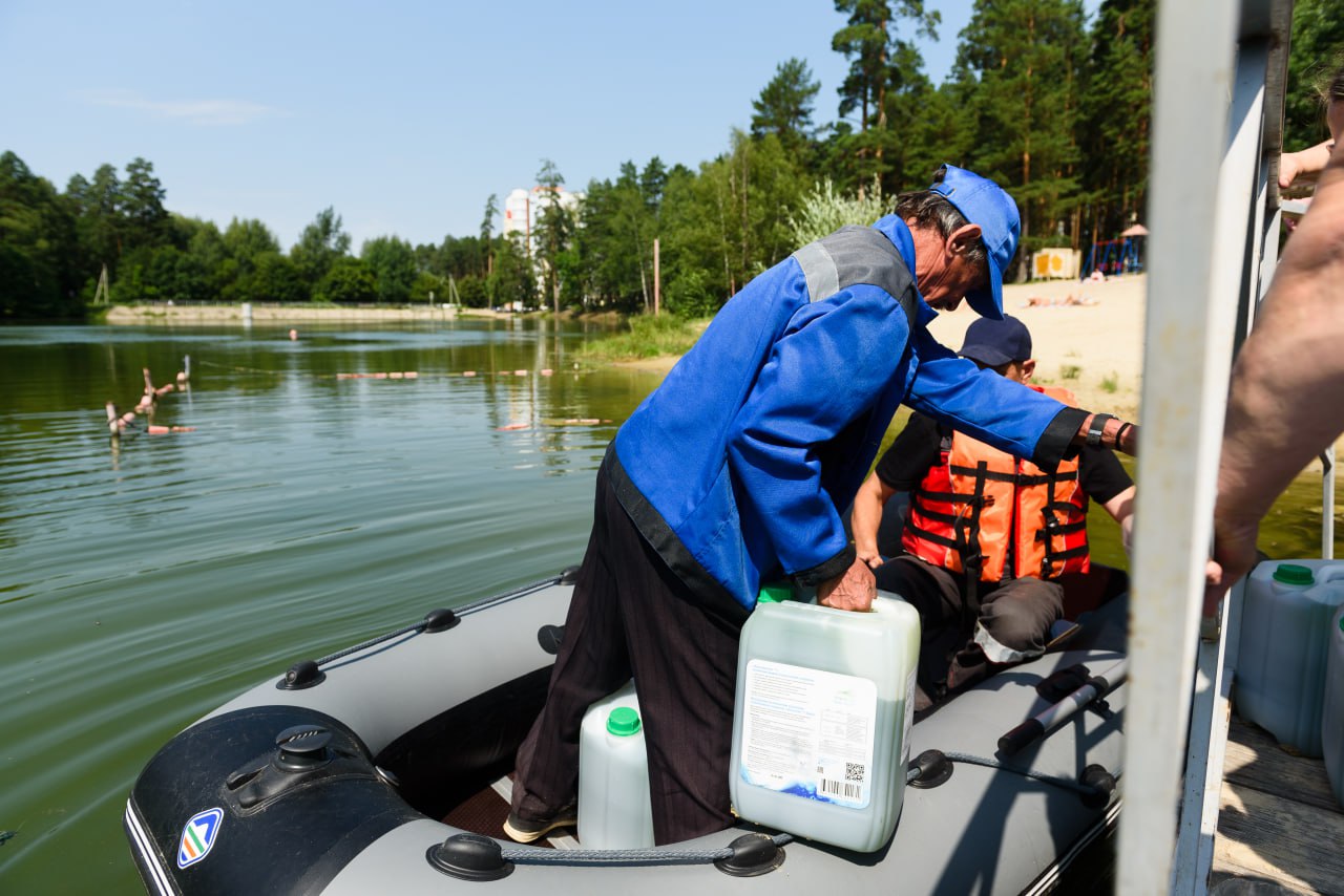 В пляжной зоне используется «Альголизосорб» для борьбы с нитчатыми водорослями, а по всему объему пруда работают «Альготексплит», расщепляющий донные отложения, и «Альготек аква» (хлорелла), чтобы подавлять развитие плавающих водорослей и улучшать среду обитания для рыбы.