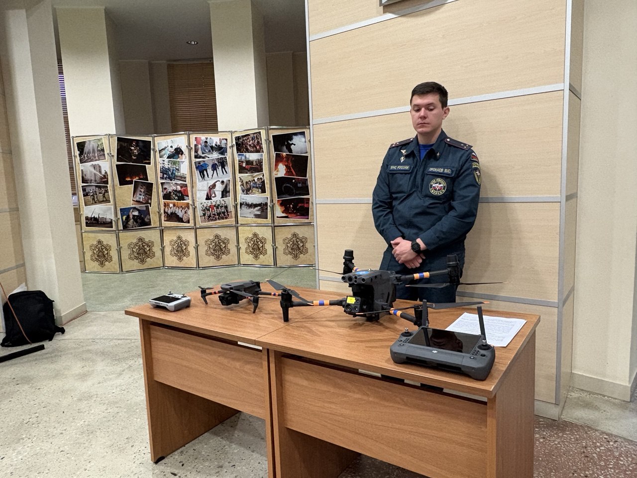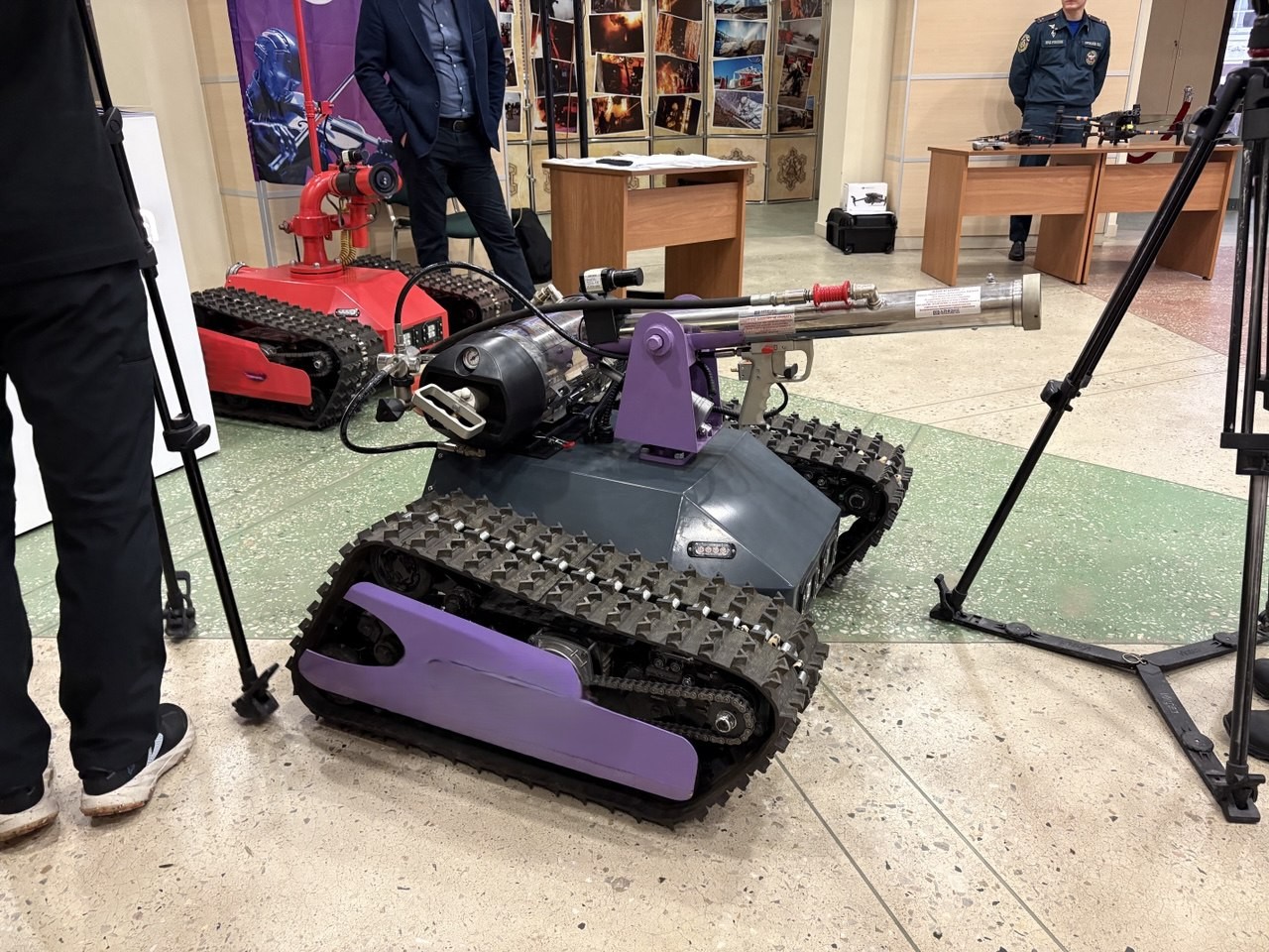 Кроме того, в фойе правительства развернулась выставка современных средств ликвидации чрезвычайных ситуаций. Гости могли осмотреть беспилотные летательные аппараты и пожарных роботов. Один из роботов предназначен для импульсного пожаротушения, второй подключается к обычным системам и тушит водой. Оба аппарата, произведенные в Саратове, могут использоваться на объектах с повышенной опасностью - складах или заводах. Роботы управляются с расстояния до 1,5 километров, оснащены системой самоорошения для защиты от огня и высокой температуры.