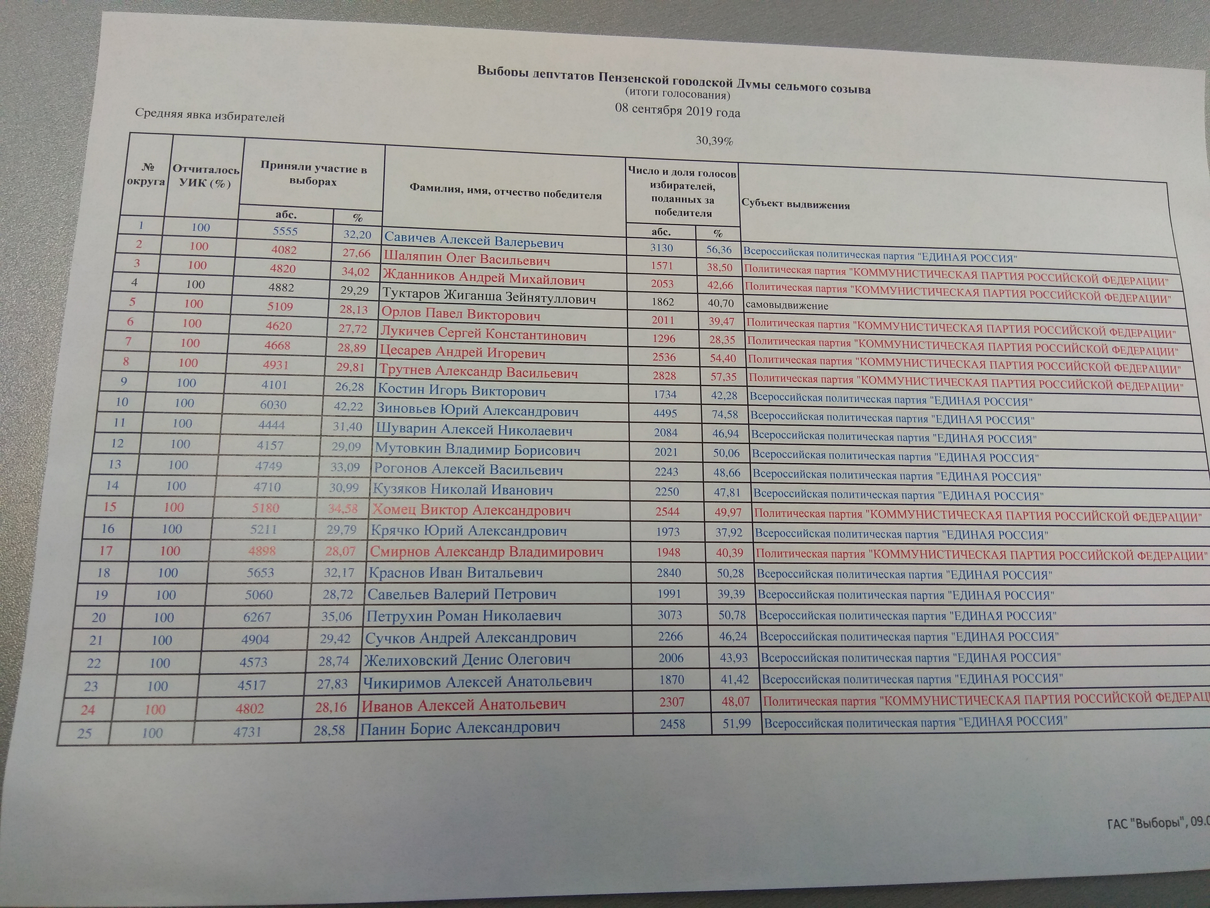 Утром в понедельник, 9 сентября, председатель избирательной комиссии Пензенской области Александр Синюков озвучил предварительные результаты голосования. Окончательные результаты по одномандатным округам в Пензе позже сообщит территориальная избирательная комиссия по Октябрьскому району, по партийным спискам имена людей будут известны к 16 сентября.