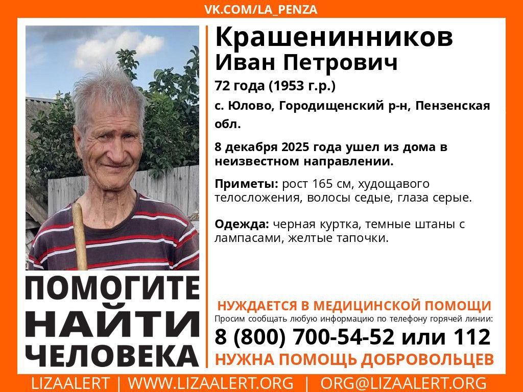 Иван Петрович Крашенинников 1953 года рождения пропал 8 декабря 2025 года. Он ушел из дома в селе Юлово в неизвестном направлении.