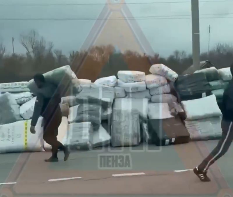 Половина М-5 перекрыта, груз с перевернутой фуры таскают вручную